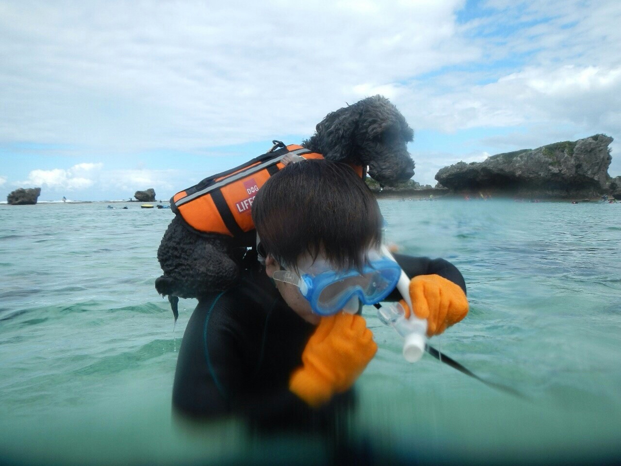 本当は犬をつれてシュノーケリングなんてありえないかもしれないのですが、僕とサスケは二人でひとつ。